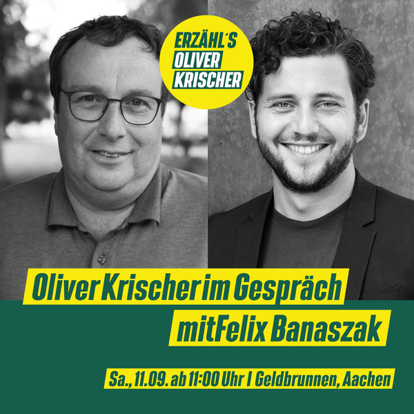 Seid dabei, im Talk zwischen unserem Bundestagskandidaten Oliver Krischer und Felix Banaszak, direkt vor Ort oder live auf unserem Instagram Kanal.