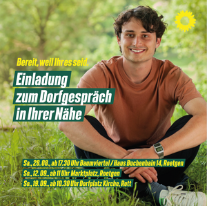 Am 19. September haben interessierte Bürger*innen in Roetgen, Rott und Mulartshütte zum dritten Mal die Gelegenheit, ihren Kandidaten Lukas Benner zu treffen.