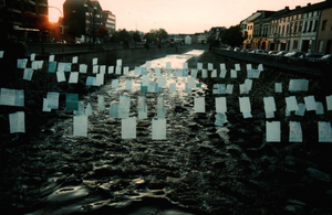 Was hier über der Inde in Eschweiler flattert, sind keine Wäschestücke, sondern Volkszählungsbögen, die die Grünen als Protest gegen die Volkszählung über den Fluss gehängt haben.