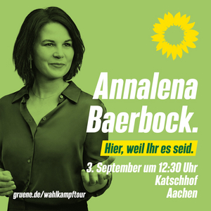 Ab 12:30 Uhr könnt Ihr euch auf eine spannende Rede von Annalena Baerbock am Katschhof, Aachen freuen. Auch für einen Austausch & die Beantwortung einiger Fragen aus dem Publikum wird genug Zeit sein.