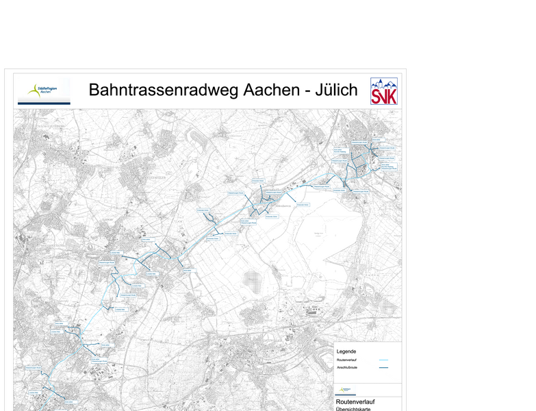 Beginnend am ehemaligen Aachener Nordbahnhof (Nähe Europaplatz) führt der Radweg auf 16 km über Würselen-Mitte und Alsdorf bis an die Grenze der Gemeinde Aldenhoven. Von dort aus geht schon heute der bestehende Bahntrassenradweg parallel zur Landstraße 136 bis nach Jülich weiter. (Routenverlauf)
