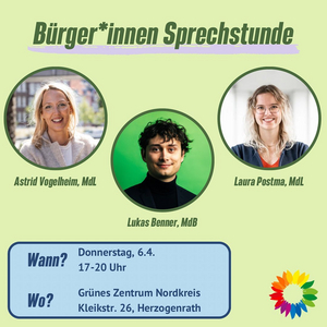 Lukas Benner MdB, Laura Postma MdL und Astrid Vogelheim MdL freuen sich auf euch.