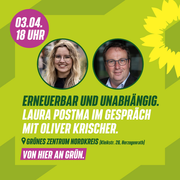 Mit Oliver Krischer, Mitglied im Deutschen Bundestag und Parlamentarischer Staatssekretär beim Bundesminister für Wirtschaft und Klimaschutz, spricht Laura Postma, unsere Direktkandidatin für die Landtagswahl, über die Energiewende und darüber, wie wir unabhängig werden können von Kohle, Gas und Diktatoren.