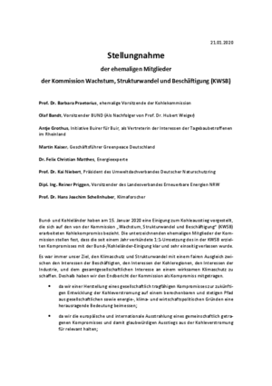 Acht frühere Mitglieder der ehemaligen Kohlekommission (KWSB), darunter die Vorsitzende Prof. Dr. Barbara Praetorius, Antje Grothus, Initiative Buirer für Buir, und der frühere NRW Landesvorsitzende der Grünen Reiner Priggen (Aachen) haben in einem gemeinsamen Positionspapier die Pläne der Bundesregierung und der Kohleländer zum Ausstieg aus der Kohle scharf kritisiert. „Mit der Bund-Kohleländer-Einigung zum Kohleausstieg vom 15. Januar 2020 sehen wir Buchstaben und Geist der in den Empfehlungen der KWSB erzielten Kompromisse vor allem mit Blick auf den Klimaschutz sowie den Umgang mit den vom Braunkohletagebau betroffenen Menschen grob verletzt“, heißt es in dem Papier. Der Kohleausstiegspfad sei klimapolitisch unzureichend, die unwiederbringliche Zerstörung von Dörfern durch den Tagebau Garzweiler nicht akzeptabel. Obwohl keine neuen Kohlekraftwerke mehr in Betrieb gesetzt werden sollten, werde nun Datteln 4 ans Netz genommen, der Ausbau der erneuerbaren Energien fehle hingegen. „Wir sehen ohne entsprechende Korrekturen den in der KWSB gefundenen und von uns bisher mitgetragenen Kompromiss durch Bund und Länder aufgekündigt“, so die acht früheren Mitglieder der Kohlekommission. „Wir bedauern ausdrücklich, dass mit der nun erwartbaren Verstärkung eines weitreichenden Konflikts um die Entwicklung der Kohleverstromung in Deutschland wichtige Jahre für den Klimaschutz verloren gehen werden und sich die für Regionen, Anwohner, Beschäftige und Unternehmen scheinbar erreichte Planungssicherheit als überaus trügerisch erweisen könnte.“