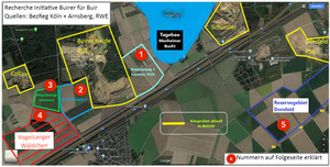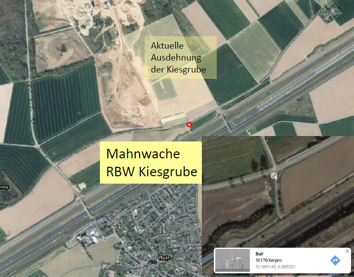 Die unsrige, die sechste, liegt an der RBW- Kiesgrube an der Kreisstraße zw. Buir und Manheim. Diese bislang wenig beachtete Form der Landschaftszerstörung – direkt am Waldrand – der Rheinischen Baustoffwerke (100%ige Tochter von RWE!) kommt aus einem besonderen Grund jetzt in den Fokus. Durch Recherchen der Buirer für Buir kam ans Licht, wie der Konzern plant den Restwald mit einer Wüste zu umgeben (s. Eingangsbild, mehr Infos auf unserer Website):