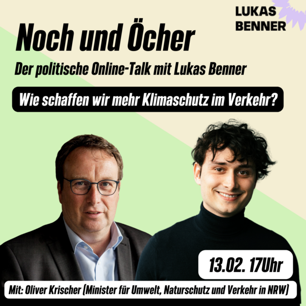 Der Verkehrssektor birgt riesige CO2-Einsparpotenziale. Ein attraktives Angebot von Bus und Bahn, E-Mobilität und hochwertige Radwegnetze gehören hierbei zu den wichtigsten Stellschrauben. Durch eine erfolgreiche Mobilitätswende würden sich gesellschaftliche Teilhabe, Umweltschutz und Lebensqualität verbessern - in der Stadt wie im ländlichen Raum. Wie können wir die Klimaziele im Verkehrsbereich in NRW erreichen? Was müsste sich auf Bundesebene ändern? Über diese und weitere Fragen diskutiert Lukas bei der nächsten Ausgabe von "Noch und Öcher" mit Oliver Krischer, Minister für Umwelt, Naturschutz und Verkehr.
