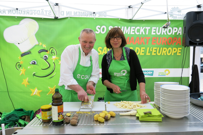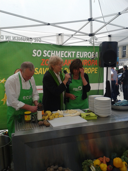 zeigte der Grüne Kreisverband am Samstag 17. Mai 2014 auf dem Aachener Markt, wie gutes Essen zubereitet werden kann. Mit dieser Aktion wollten die GRÜNEN auf die Lebensmittelverschwendung aufmerksam machen. Mit Zutaten, die eigentlich für die Tonne bestimmt waren zauberten Rebecca Harms, Spitzenkandidatin der Europa GRÜNEN mit Hilfe eines belgischen Spitzenkochs ein köstliches Gericht. Nebenbei wurde über europäische Themen berichtet.