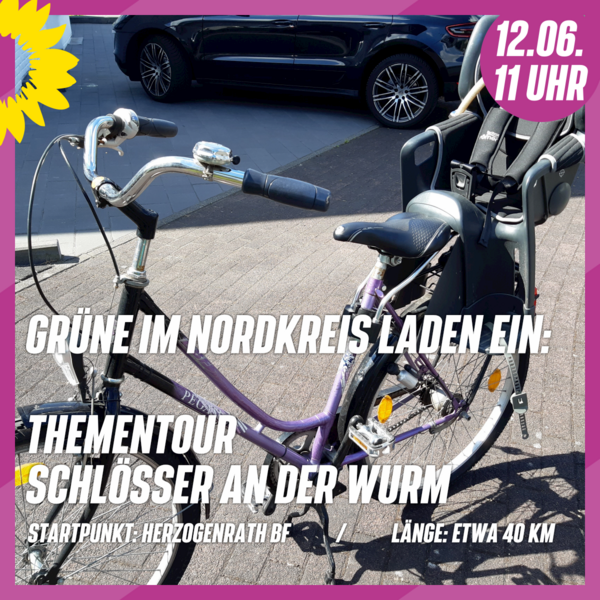 Wie schon im letzten Jahr laden die Grünen Stadtradeln-Teams aus dem Nordkreis erneut an einem Sonntag im Aktionszeitraum zum Mitradeln ein. Hierbei sind ebenso Radelnde anderer Teams willkommen. Zentraler Treffpunkt ist der Bahnhof Herzogenrath. Von hier aus geht es unter dem Thema "Die Schlösser an der Wurm" in den Kreis Heinsberg. Rolf Beckers vom Baesweiler "greenteam" hat die Tour ausgearbeitet, die zu fünf Schlössern führt. Die Rückroute führt durch Dörfer und Felder sowie über den Baesweiler Carl-Alexander-Park zurück zum Ausgangspunkt.