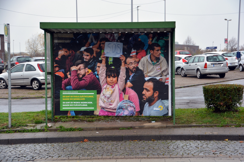 Vom 4. - 14.11.2016 sind im Nord und Südkreis Großflächenplakate aufgestellt. Vier unterschiedliche Motive zeigen die verschiedenen Etappen der Flucht. Vom Startpunkt, der gefährlichen Reise über das Mittelmeer, wartend am Budapester Bahnhof und als letzte Station bei einem Integrationskurs in Deutschland.