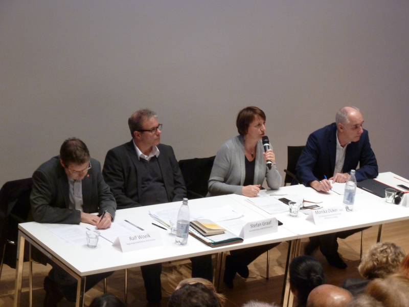 Landeshaushalt nieder. 2012 hat das Land 220 Mio. Euro in die Flüchtlingshilfe investiert, in 2016 werden es vier Mrd. Euro sein. Dieses Volumen sei verkraftbar, wegen den hohen Steuereinnahmen und den niedrigen Zinsen, so Monika Düker MdL. Der Bund beteilige sich gerade mal mit 20% an den Kosten. Nur durch die Hilfe der Kommunen sei es bislang möglich gewesen, allen ein warmes Dach über dem Kopf zu ermöglichen. Derzeit befände man sich noch im Krisenmodus, da es noch schlechte Standards in den Unterkünften gebe. Jetzt gelte es in Qualität und Entlastung der Kommunen zu investieren.